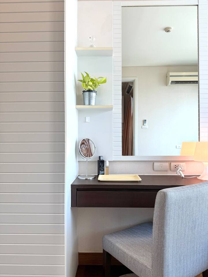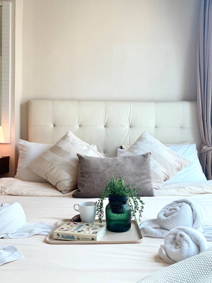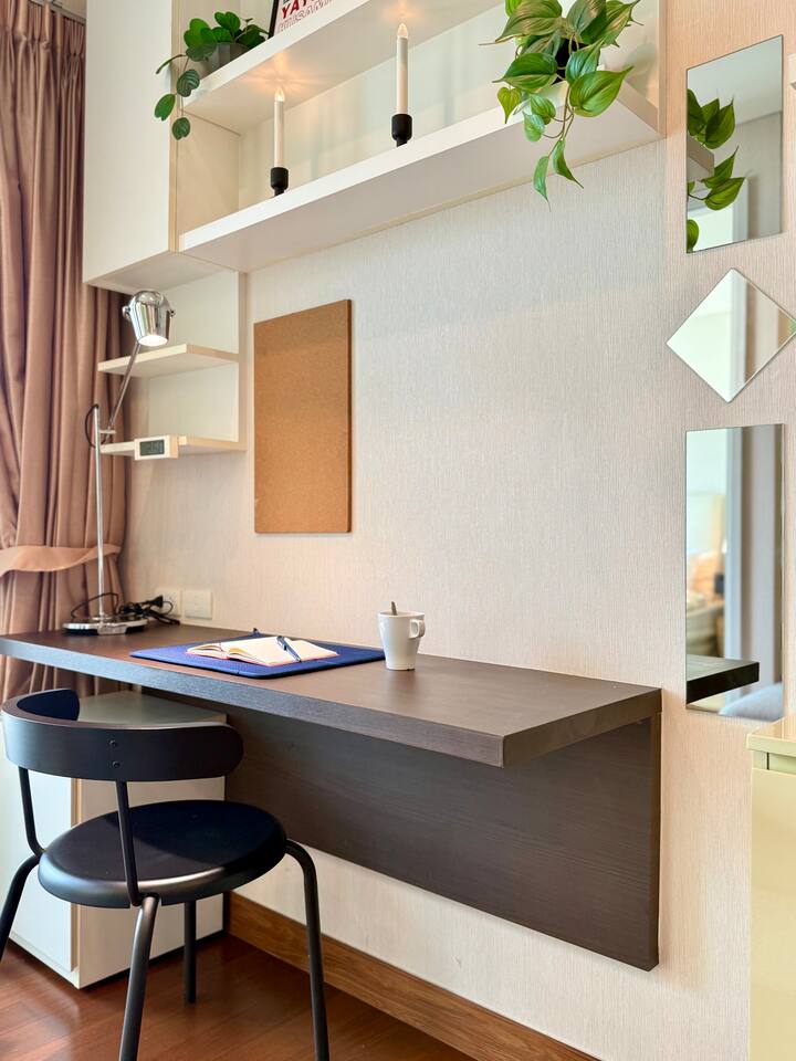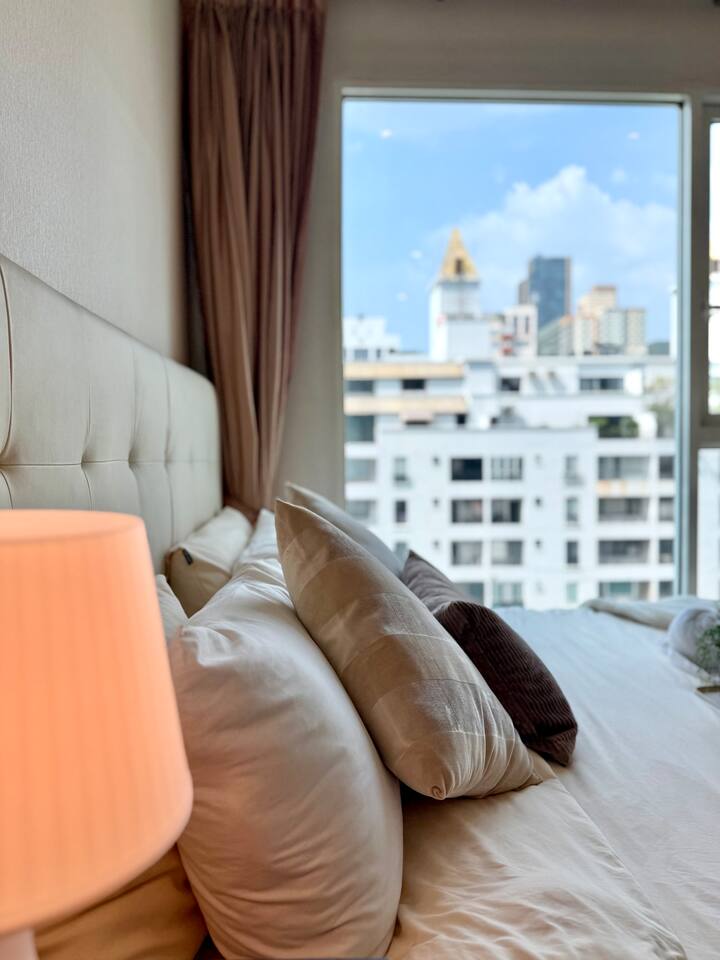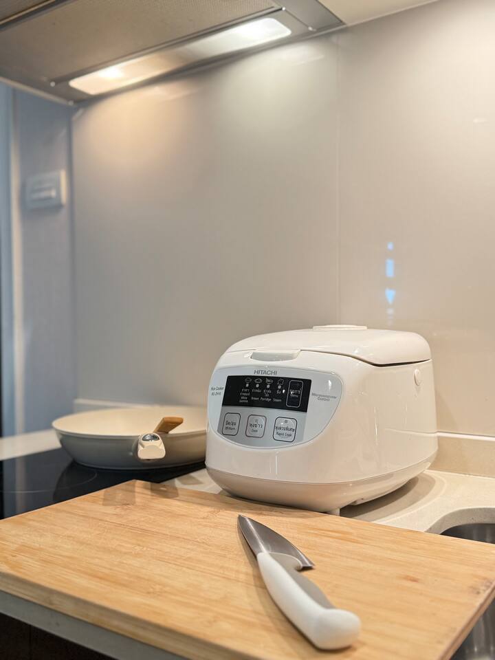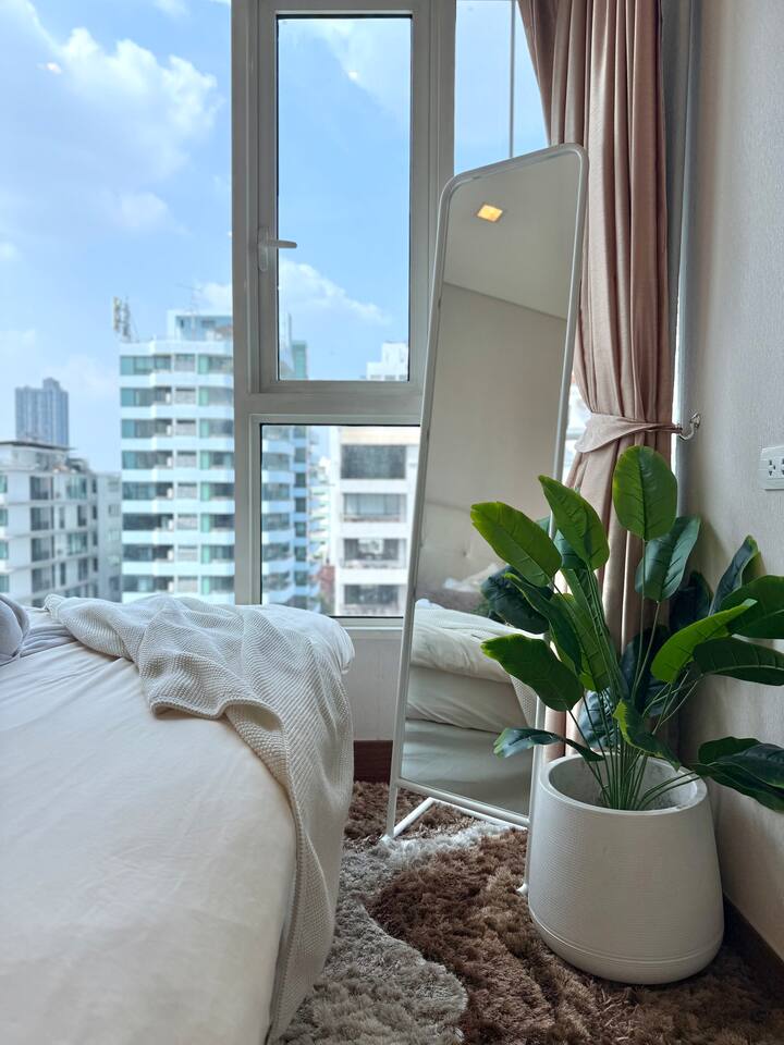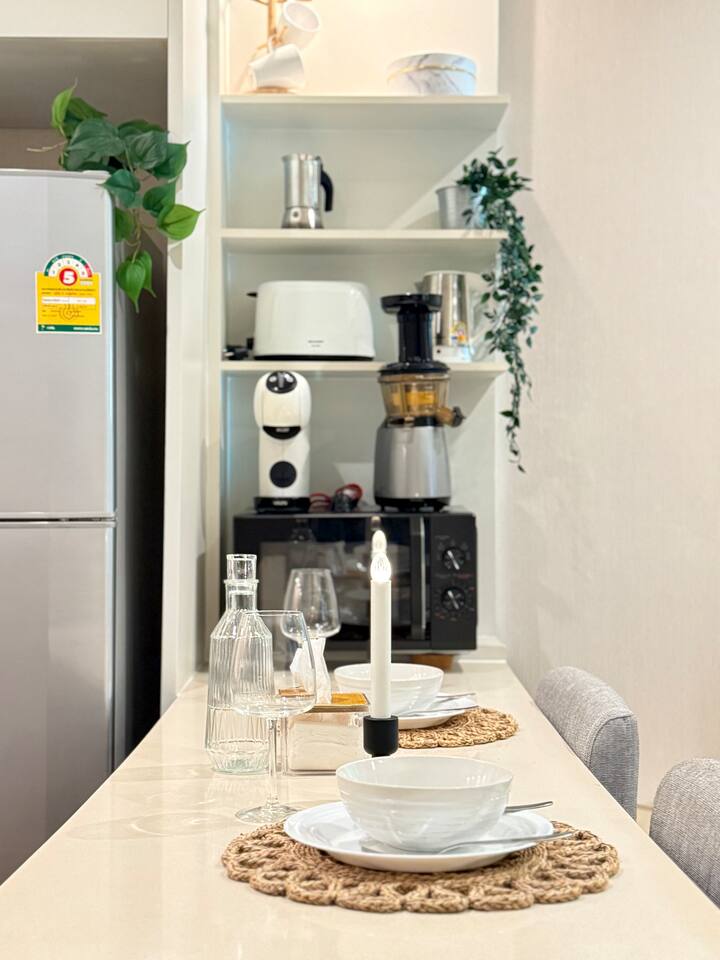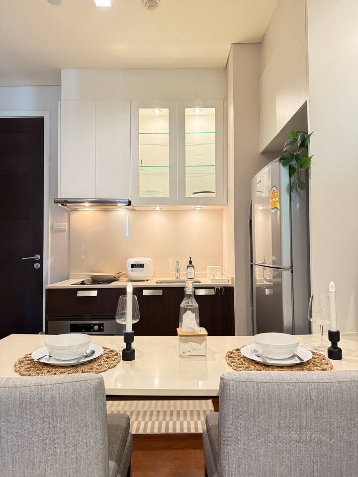 Welcome to your elegant and spacious Bangkok escape – the perfect place to relax and recharge. This 40m² apartment combines style, comfort, and convenience, with everything you need for a memorable stay: • 🍳 Open Kitchen – Fully equipped with a microwave, kettle, electric stove, coffee machine, cold-press juicer, rice cooker, and all the cookware, cutlery, and dinnerware you need to enjoy home-cooked meals. • 🛋️ Living Room – Stretch out on the comfy three-seater sofa, catch your favorite shows on the large smart TV, or get work done at the dedicated office space. • 🌿 Balcony & Laundry Corner – Step outside for some fresh air or take care of laundry with ease. • 🛏️ Bedroom – Sleep like royalty on the king-size bed, get ready at the makeup station, and enjoy the spacious dressing area with city views. • 🛁 Bathroom – Treat yourself to a relaxing soak in the jacuzzi bath or a refreshing shower. Stay connected with high-speed Wi-Fi throughout the apartment. As a guest, you’ll also enjoy premium building facilities: 🏊 Swimming pool | 🏋️ Gym | 🎹 Piano lounge | 🌱 Garden areas | 🧸 Kids room 📍 Location Set in the heart of Thonglor, one of Bangkok’s trendiest neighborhoods, you’ll be surrounded by stylish cafés, world-class dining, vibrant nightlife, and boutique shopping. The area is also well-connected, making it easy to explore the city while enjoying a peaceful retreat when you return.