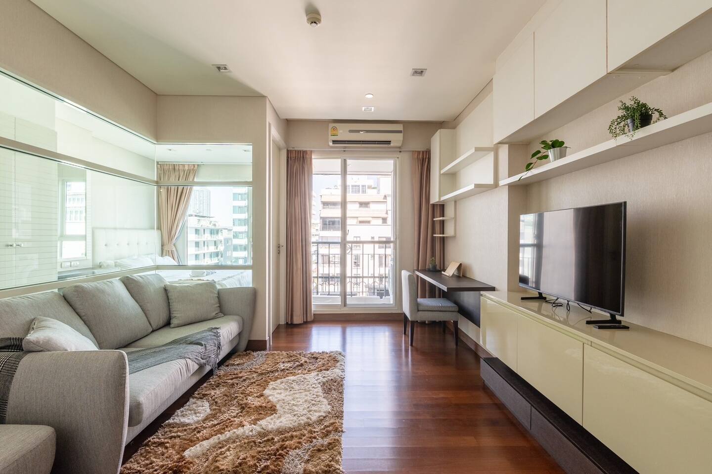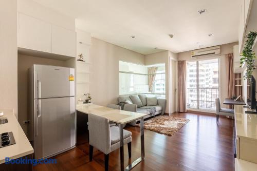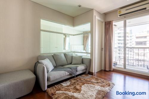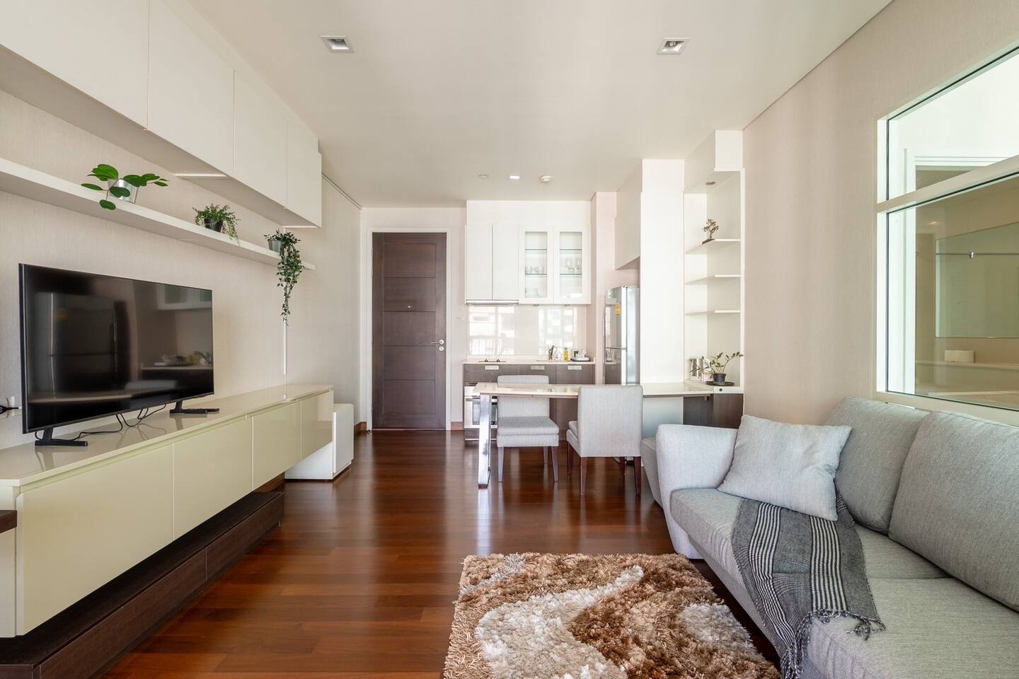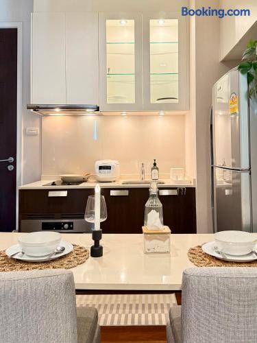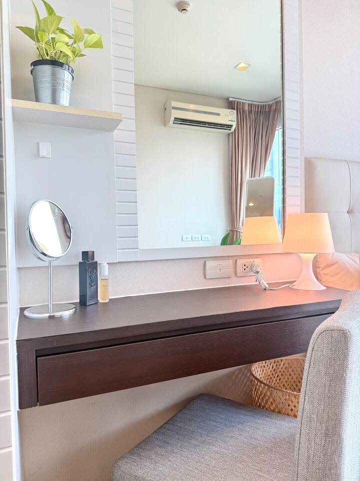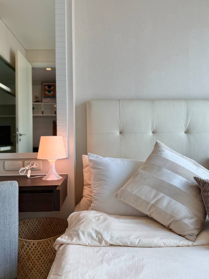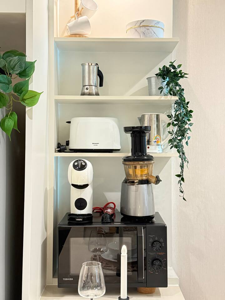 Welcome to your elegant and spacious Bangkok escape – the perfect place to relax and recharge. This 40m² apartment combines style, comfort, and convenience, with everything you need for a memorable stay: • 🍳 Open Kitchen – Fully equipped with a microwave, kettle, electric stove, coffee machine, cold-press juicer, rice cooker, and all the cookware, cutlery, and dinnerware you need to enjoy home-cooked meals. • 🛋️ Living Room – Stretch out on the comfy three-seater sofa, catch your favorite shows on the large smart TV, or get work done at the dedicated office space. • 🌿 Balcony & Laundry Corner – Step outside for some fresh air or take care of laundry with ease. • 🛏️ Bedroom – Sleep like royalty on the king-size bed, get ready at the makeup station, and enjoy the spacious dressing area with city views. • 🛁 Bathroom – Treat yourself to a relaxing soak in the jacuzzi bath or a refreshing shower. Stay connected with high-speed Wi-Fi throughout the apartment. As a guest, you’ll also enjoy premium building facilities: 🏊 Swimming pool | 🏋️ Gym | 🎹 Piano lounge | 🌱 Garden areas | 🧸 Kids room 📍 Location Set in the heart of Thonglor, one of Bangkok’s trendiest neighborhoods, you’ll be surrounded by stylish cafés, world-class dining, vibrant nightlife, and boutique shopping. The area is also well-connected, making it easy to explore the city while enjoying a peaceful retreat when you return.